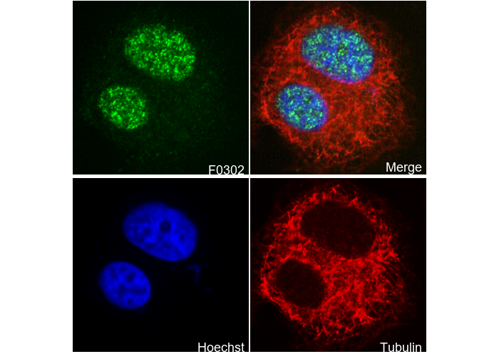 • Immunofluorescent analysis of MCF-7 cells using F0302 (green, 1:800), Hoechst (blue) and tubulin (Red).