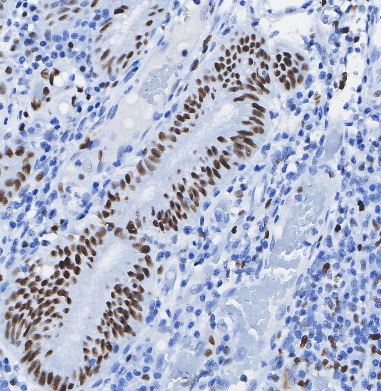 • Immunohistochemical analysis of formalin fixed paraffin embedded human Colorectal cancer tissue with F0302 at 1/100 dilution.
