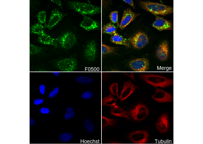 • Immunofluorescent analysis of Hela cells using F0500 (green, 1:400), Hoechst (blue) and tubulin (Red).