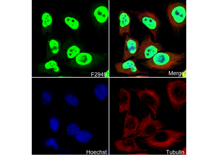 • Immunofluorescent analysis of Hela cells using F2949 (green, 1:250), Hoechst (blue) and tubulin (Red).