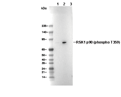 Phospho-RSK1 p90 (Thr359) Antibody [L24F14] detects endogenous levels of RSK1 p90 protein only when Phosphorylated at Thr 359.