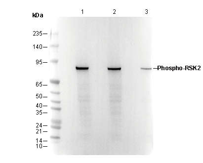 Phospho-RSK2 (Ser227) Antibody [F3D15] detects endogenous levels of RSK2 only when phosphorylated at Ser227. It shows cross-reactivity with RSK1 when phosphorylated at the homologous serine residues.