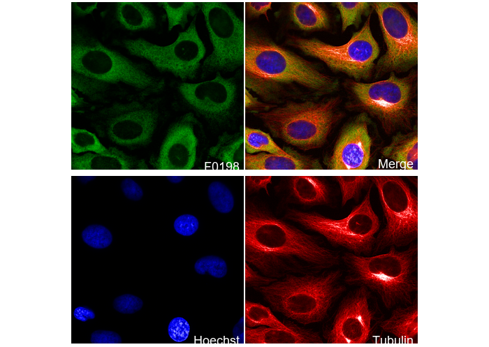 • Immunofluorescent analysis of Hela cells using F0198 (green, 1:200), Hoechst (blue) and tubulin (Red).