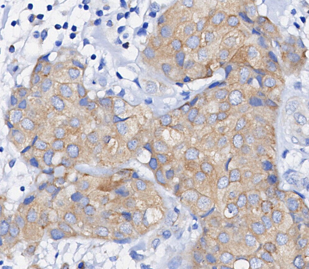 • Immunohistochemical analysis of formalin fixed paraffin embedded human breast cancer tissue with F0198 at 1/100 dilution.