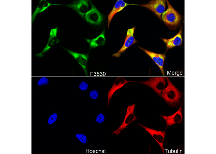 • Immunofluorescent analysis of Hela cells using F3530 (green, 1:100), Hoechst (blue) and tubulin (Red).