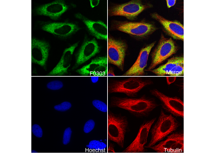 • Immunofluorescent analysis of Hela cells (Insulin-treated) using F0303 (green, 1:800), Hoechst (blue) and tubulin (Red).