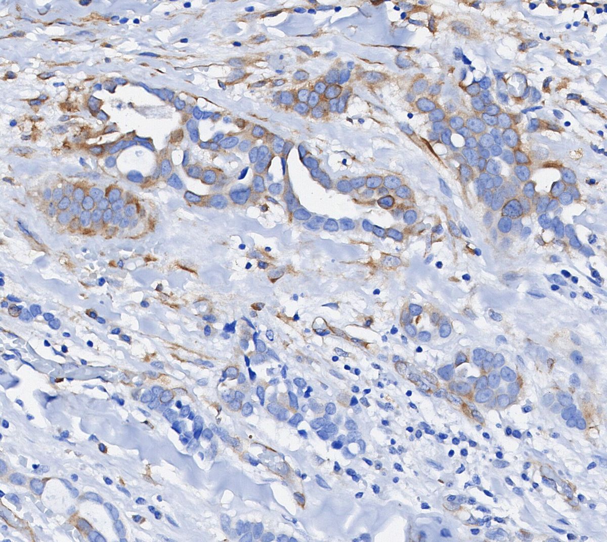 • Immunohistochemical analysis of formalin fixed paraffin embedded human breast cancer tissue with F0303 at 1/200 dilution.