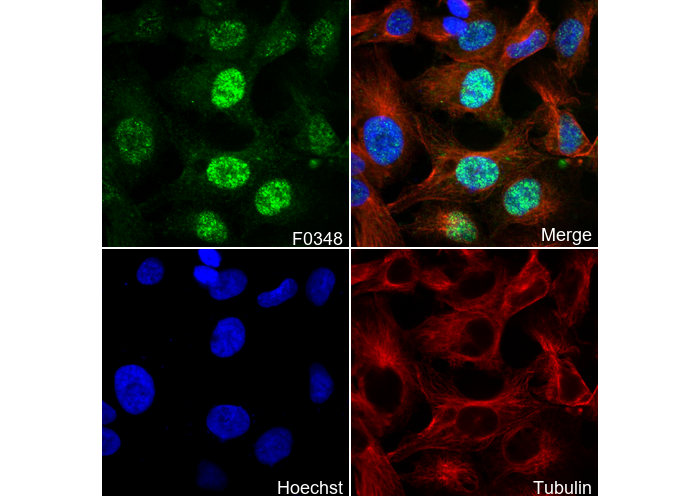 • Immunofluorescent analysis of HT1080 cells using F0348 (green, 1:800), Hoechst (blue) and tubulin (Red).