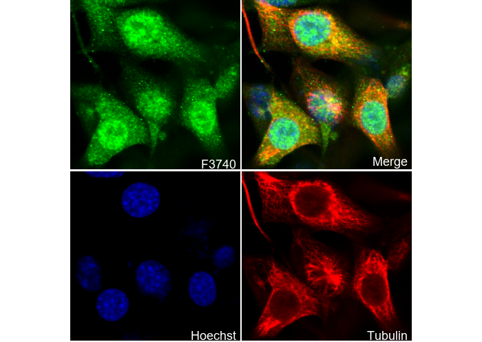 • Immunofluorescent analysis of NIH/3T3 cells (TGF-β1-treated) using F3740 (green, 1:50), Hoechst (blue) and tubulin (Red).