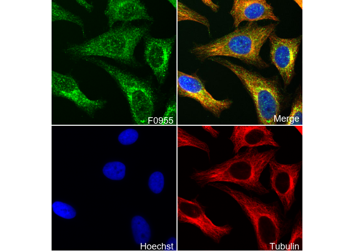 • Immunofluorescent analysis of Hela cells using F0955 (green, 1:50), Hoechst (blue) and tubulin (Red).