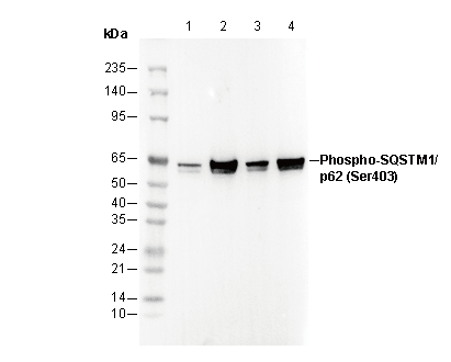 Phospho-SQSTM1/p62 (Ser403) Antibody [B10J4] recognizes endogenous levels of SQSTM1/p62 protein only when phosphorylated at Ser403.