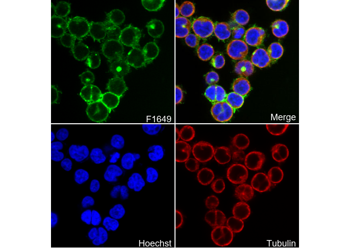 • Immunofluorescent analysis of Jurkat cells using F1649 (green, 1:250), Hoechst (blue) and tubulin (Red).