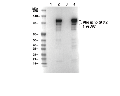• Lane 1: U266 (serum-starved), Lane 2: U266 (serum-starved; hIFN-α1, 10 ng/ml), Lane 3: A-431 (serum-starved), Lane 4: A-431 (serum-starved; hIFN-α1, 10 ng/ml)