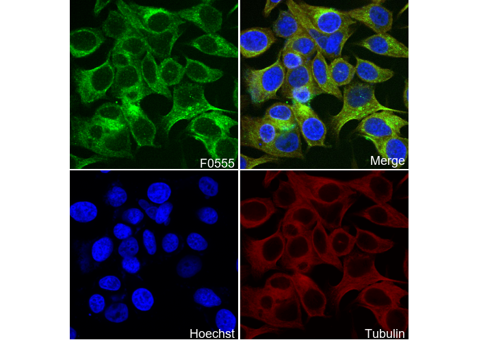 • Immunofluorescent analysis of MCF-7 cells, treated with IL-4 (100 ng/ml, 30min), using F0555 (green, 1:200), Hoechst (blue) and tubulin (Red).