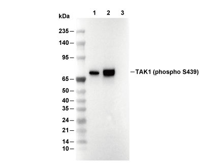 Phospho-TAK1 (Ser439) Antibody [F17C11] detects endogenous levels of total TAK1 protein only when it is phosphorylated at Ser439.