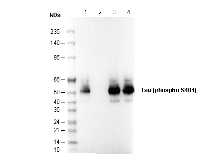 Phospho-Tau (Ser404) Antibody [F11H2] recognizes endogenous levels of Tau only when phosphorylated at serine 404.