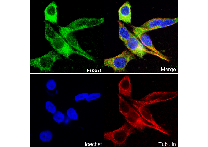 • Immunofluorescent analysis of MCF-7 cells using F0351 (green, 1:1600), Hoechst (blue) and tubulin (Red).