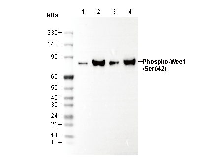 Phospho-Wee1 (Ser642) Antibody [P3A10] detects endogenous levels of Wee1 protein only when phosphorylated at Ser642.