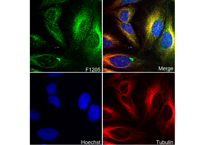 • Immunofluorescent analysis of Hela cells using F1205 (green, 1:150), Hoechst (blue) and tubulin (Red).