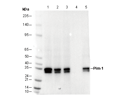 Pim-1 Antibody [C2K23] recognizes endogenous levels of total Pim-1 protein. No cross reactivity was detected with other Pim family members.