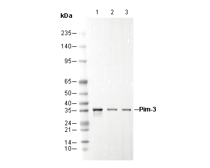 Pim-3 Antibody [H6L6] detects endogenous levels of total Pim-3 protein. It does not cross-react with other Pim family members.