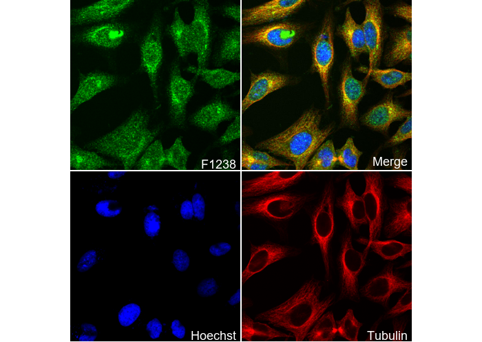 • Immunofluorescent analysis of Hela cells using F1238 (green, 1:200), Hoechst (blue) and tubulin (Red).