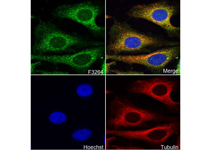 • Immunofluorescent analysis of Hela cells using F3264 (green, 1:100), Hoechst (blue) and tubulin (Red).