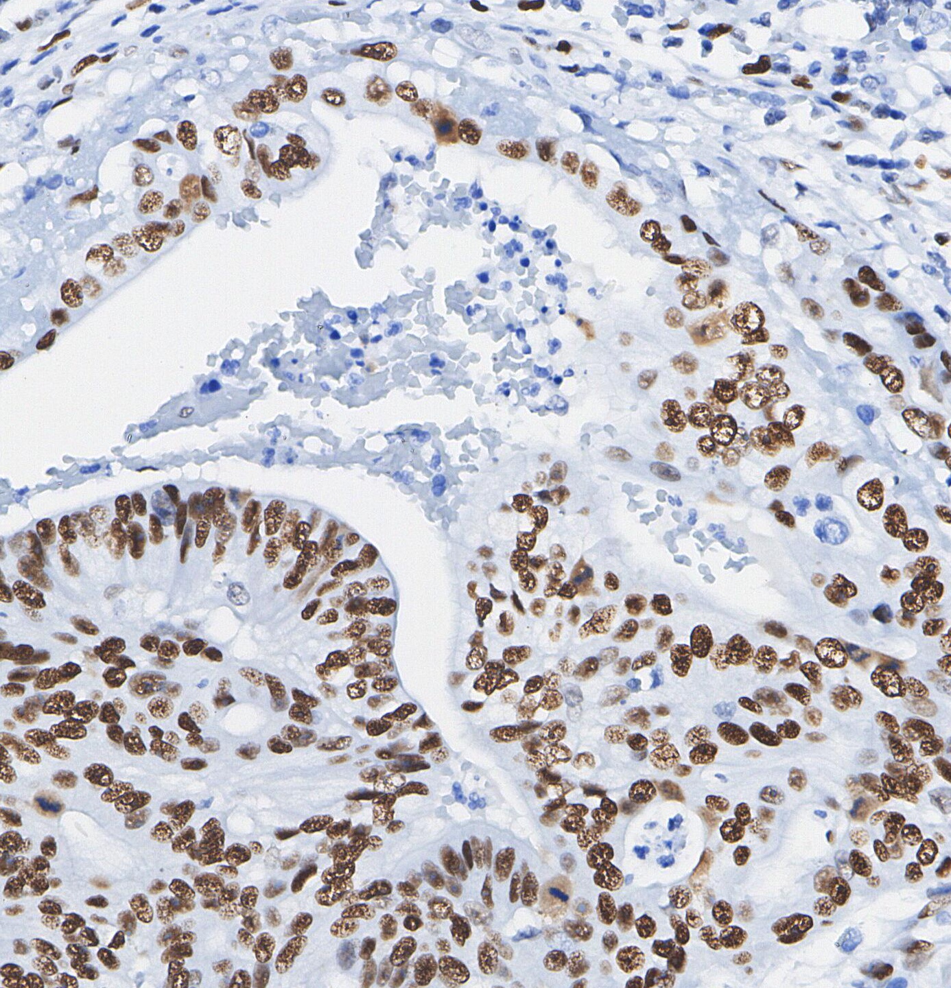 • Immunohistochemical analysis of formalin fixed paraffin embedded human Colorectal cancer tissue with F0393 at 1/100 dilution.