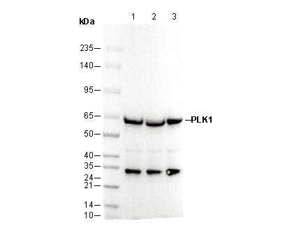 PLK1 Antibody [P4E9] recognizes endogenous levels of total PLK1 protein.