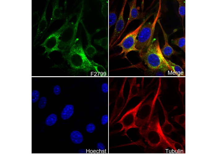 • Immunofluorescent analysis of bEnd.3 cells using F2799 (green, 1:1000), Hoechst (blue) and tubulin (Red).