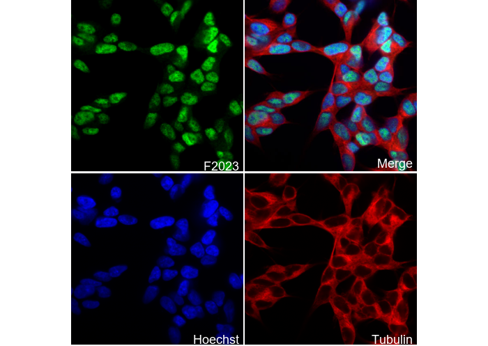 • Immunofluorescent analysis of SH-SY5Y cells using F2023 (green, 1:200), Hoechst (blue) and tubulin (Red).