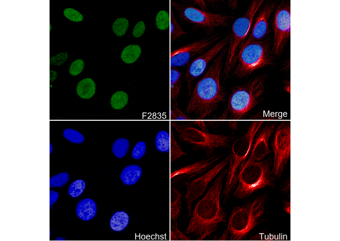 • Immunofluorescent analysis of Hela cells using F2835 (green, 1:250), Hoechst (blue) and tubulin (Red).