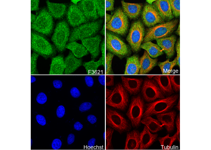 • Immunofluorescent analysis of HepG2 cells using F3621 (green, 1:50), Hoechst (blue) and tubulin (Red).