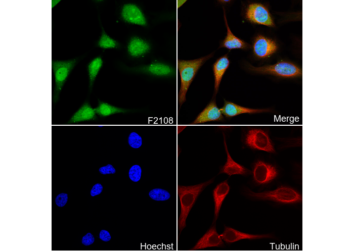• Immunofluorescent analysis of Hela cells using F2108 (green, 1:250), Hoechst (blue) and tubulin (Red).