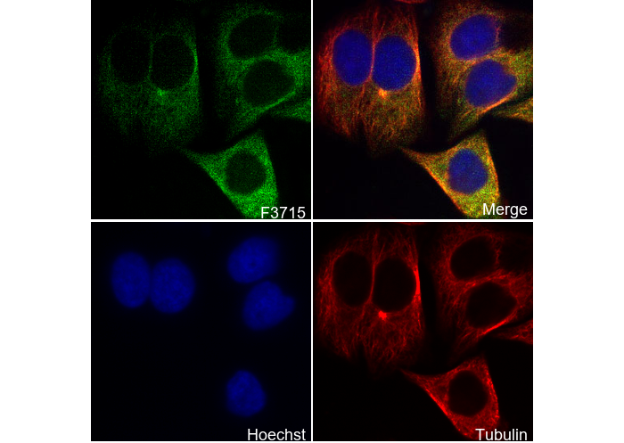 • Immunofluorescent analysis of HepG2 cells using F3715 (green, 1:250), Hoechst (blue) and tubulin (Red).