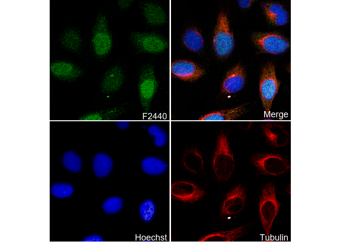 • Immunofluorescent analysis of Hela cells using F2440 (green, 1:50), Hoechst (blue) and tubulin (Red).