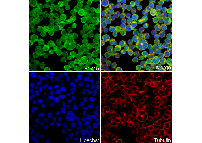 • Immunofluorescent analysis of Jurkat cells using F1715 (green, 1:200), Hoechst (blue) and tubulin (Red).