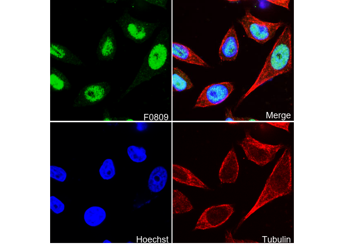 • Immunofluorescent analysis of MCF-7 cells using F0809 (green, 1:800), Hoechst (blue) and tubulin (Red).