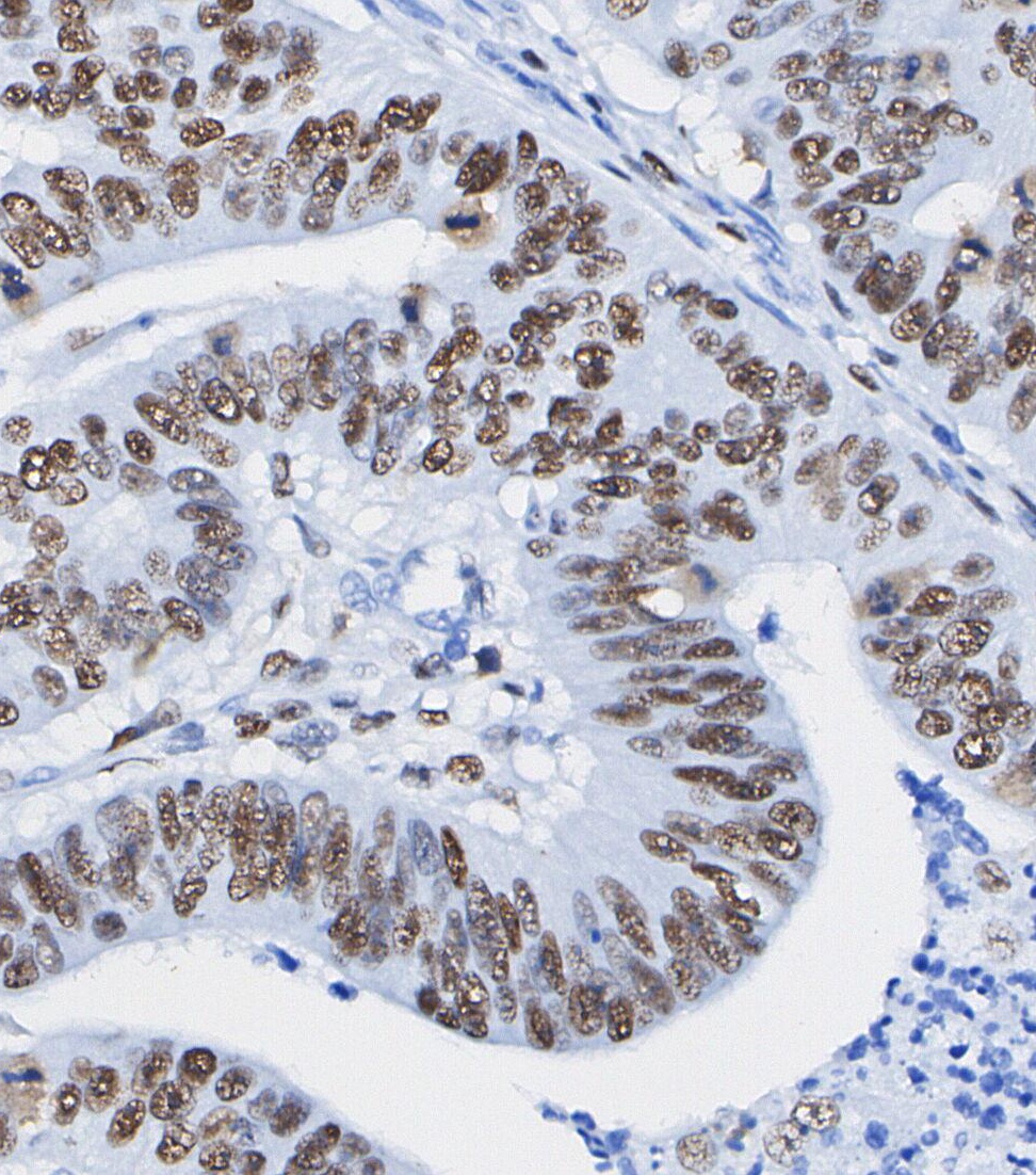 • Immunohistochemical analysis of formalin fixed paraffin embedded human Colorectal cancer tissue with F0809 at 1/100 dilution.