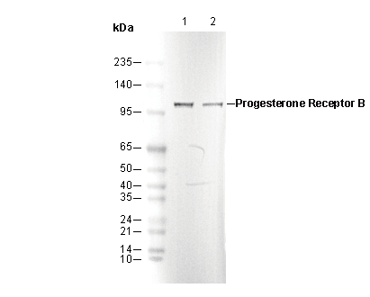 Progesterone Receptor B Antibody [B13J21] detects endogenous levels of total progesterone receptor B protein. This antibody does not cross-react with other PR family members.