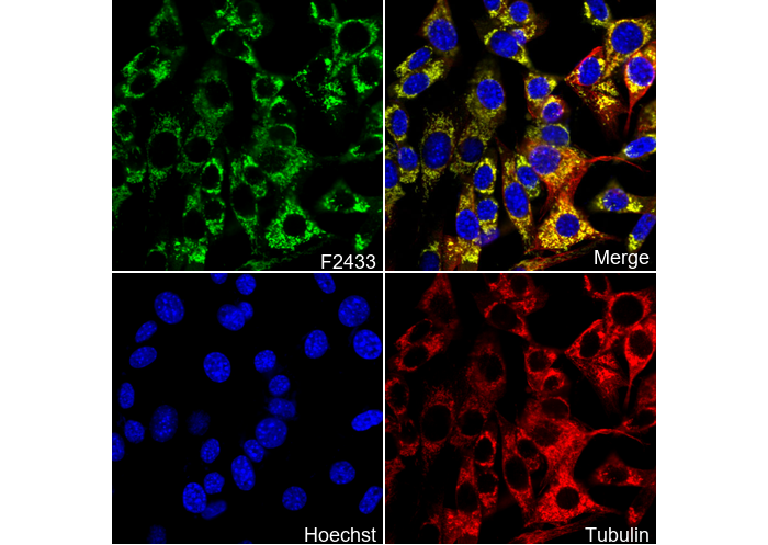 • Immunofluorescent analysis of NIH/3T3 cells using F2433 (green, 1:100), Hoechst (blue) and tubulin (Red).
