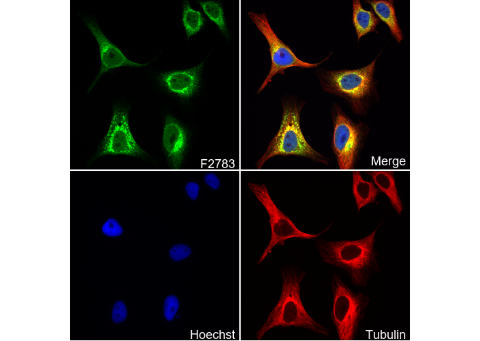 • Immunofluorescent analysis of Hela cells using F2783 (green, 1:250), Hoechst (blue) and tubulin (Red).