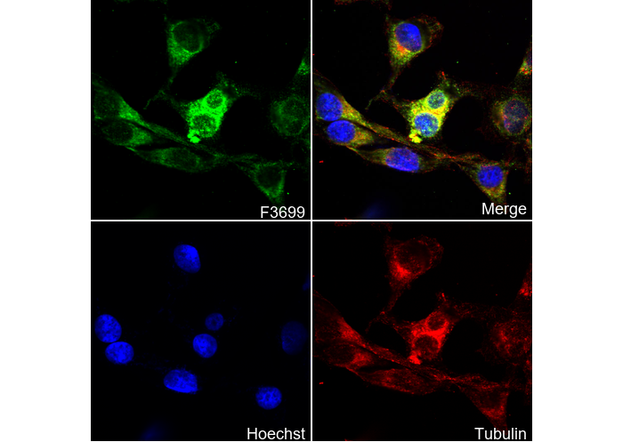 • Immunofluorescent analysis of Hela cells using F3699 (green, 1:100), Hoechst (blue) and tubulin (Red).