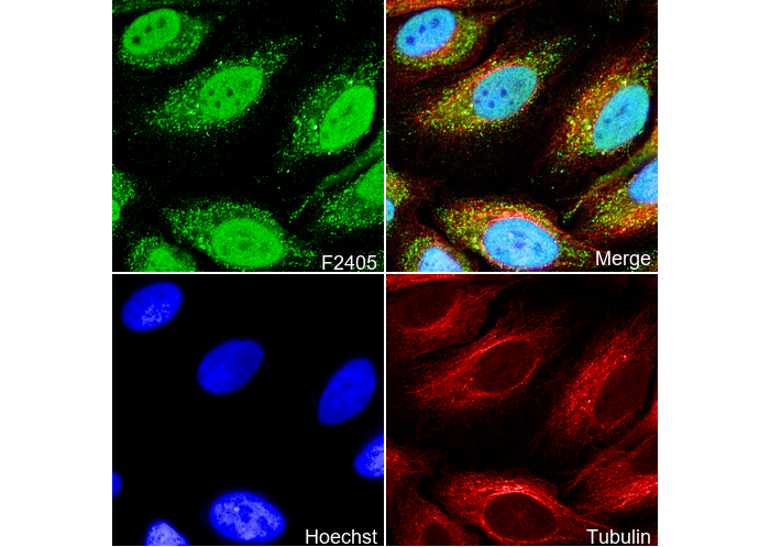 • Immunofluorescent analysis of Hela cells using F2405 (green, 1:100), Hoechst (blue) and tubulin (Red).