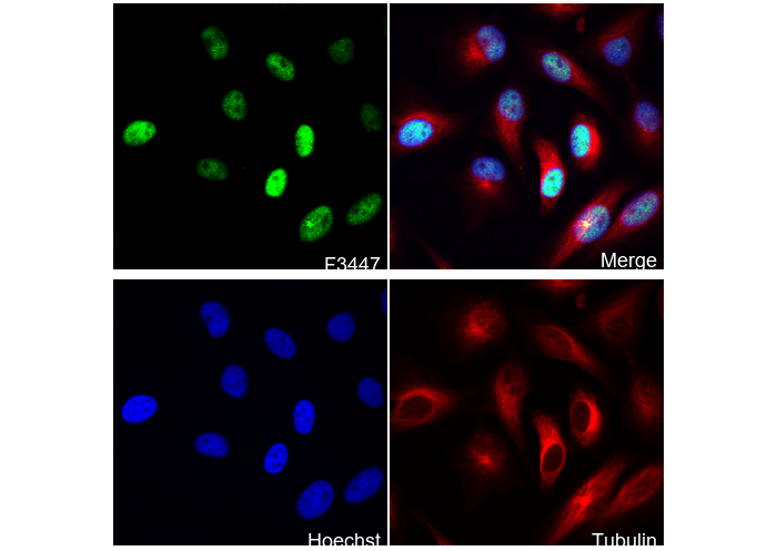• Immunofluorescent analysis of Hela cells using F3447 (green, 1:100), Hoechst (blue) and tubulin (Red).