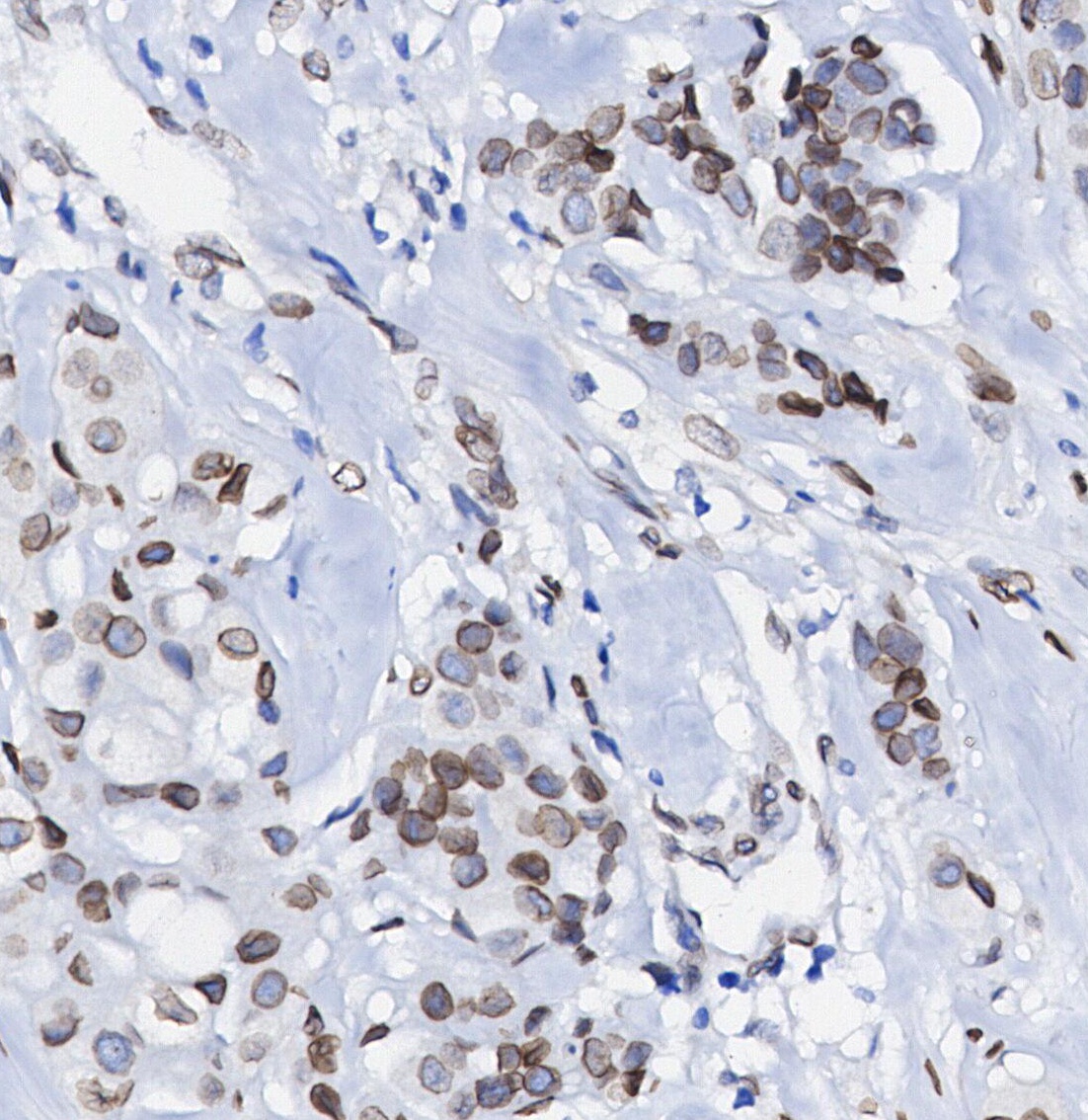 • Immunohistochemical analysis of formalin fixed paraffin embedded human breast cancer tissue with F0442 at 1/100 dilution.