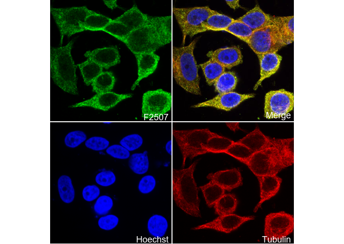 • Immunofluorescent analysis of MCF-7 cells using F2507 (green, 1:100), Hoechst (blue) and tubulin (Red).