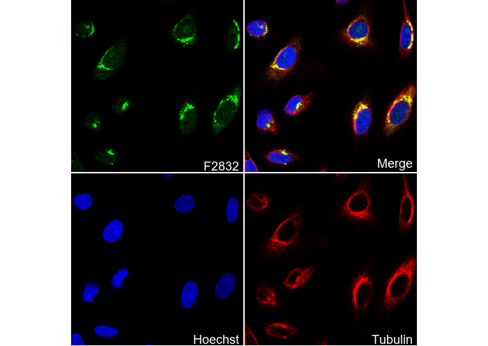 • Immunofluorescent analysis of Hela cells using F2832 (green, 1:170 ), Hoechst (blue) and tubulin (Red).