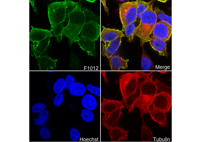 • Immunofluorescent analysis of MCF-7 cells using F1012 (green, 1:20), Hoechst (blue) and tubulin (Red).