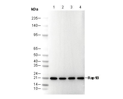 Rap1B Antibody [H22K21] detects endogenous levels of total Rap1B protein. It does not cross-react with Rap1A.